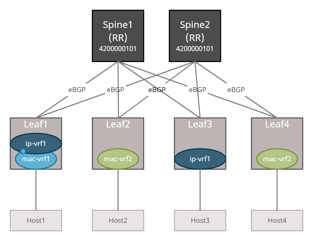 And finally, you have host2 and host4 in the same broadcast domain (mac-vrf2) and they’ll reach each other via the IP addresses from the same subnet. Host1 is connected to ip-vrf1 via mac-vrf1 and it can be routed to host3 which is directly connected to the ip-vrf1.